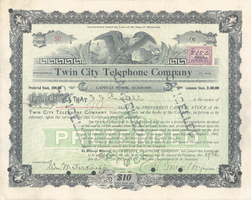 A stock certificate for Twin City Telephone Company (THG file photo)